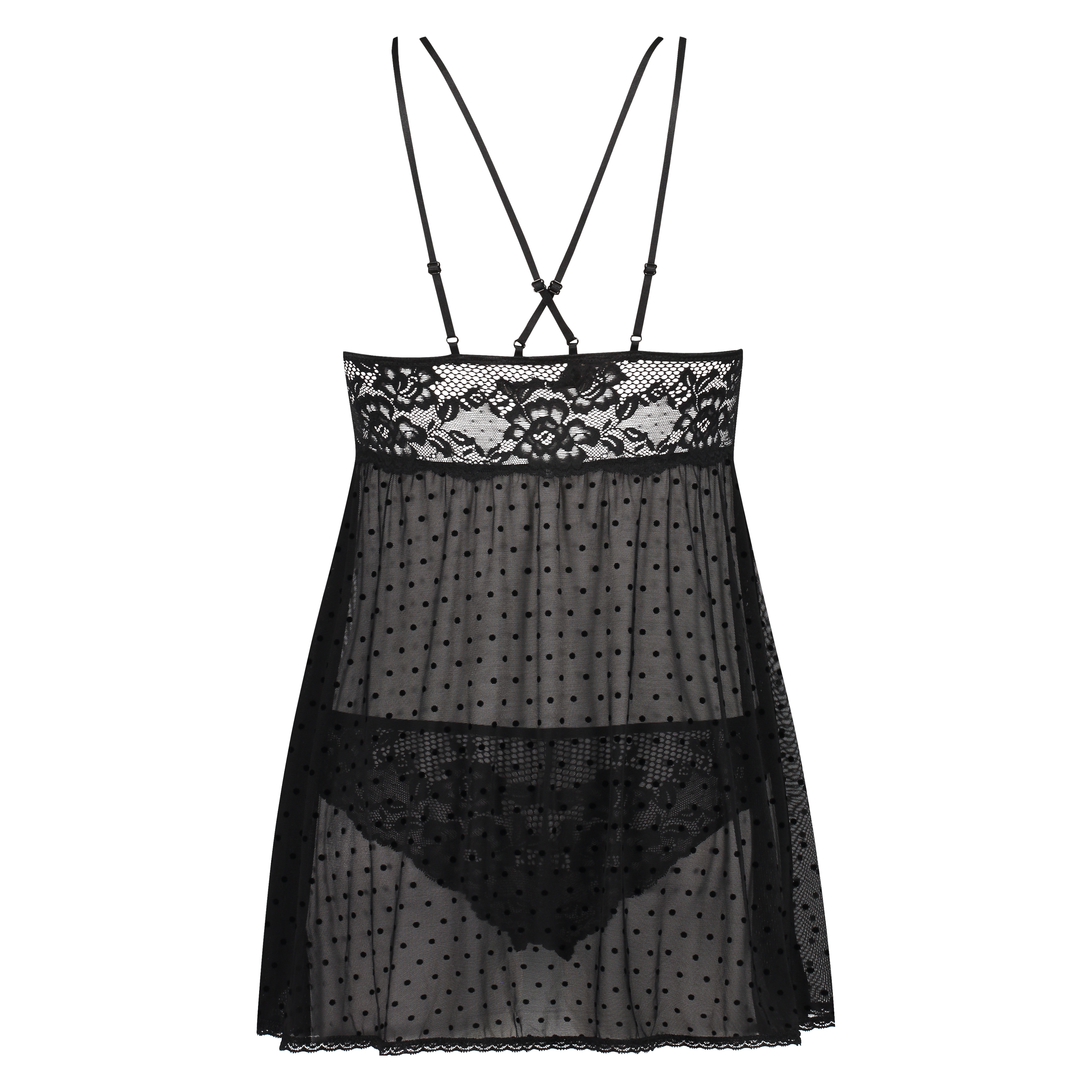 Sentez-vous sexy dans cette non-wired baby-doll ! La baby-doll comporte des détails en dentelle et en maille, des bretelles réglables et est agrémentée d'un motif de points. La culotte assortie est confectionnée en dentelle et en mesh.