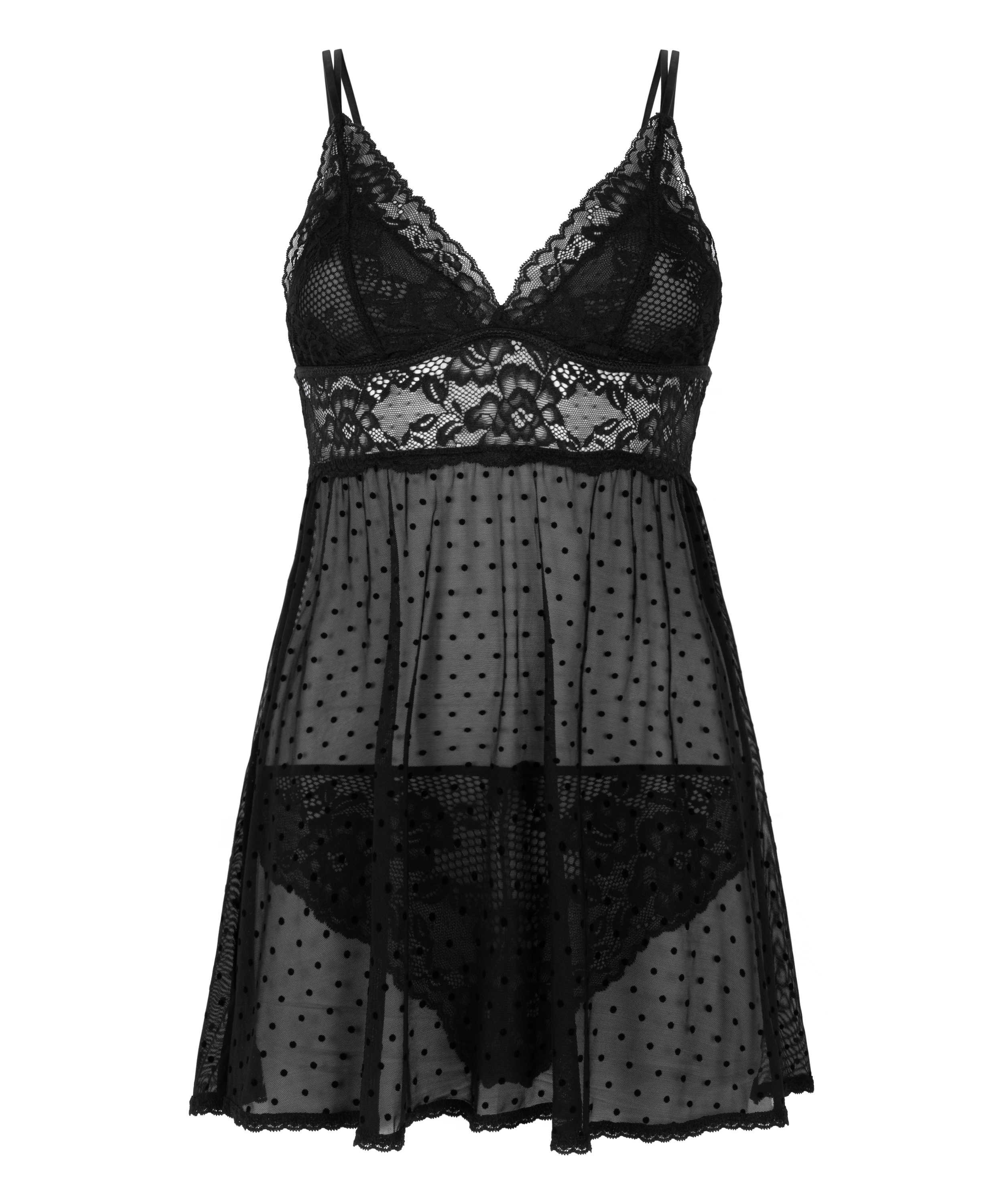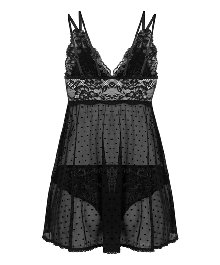 Sentez-vous sexy dans cette non-wired baby-doll ! La baby-doll comporte des détails en dentelle et en maille, des bretelles réglables et est agrémentée d'un motif de points. La culotte assortie est confectionnée en dentelle et en mesh.