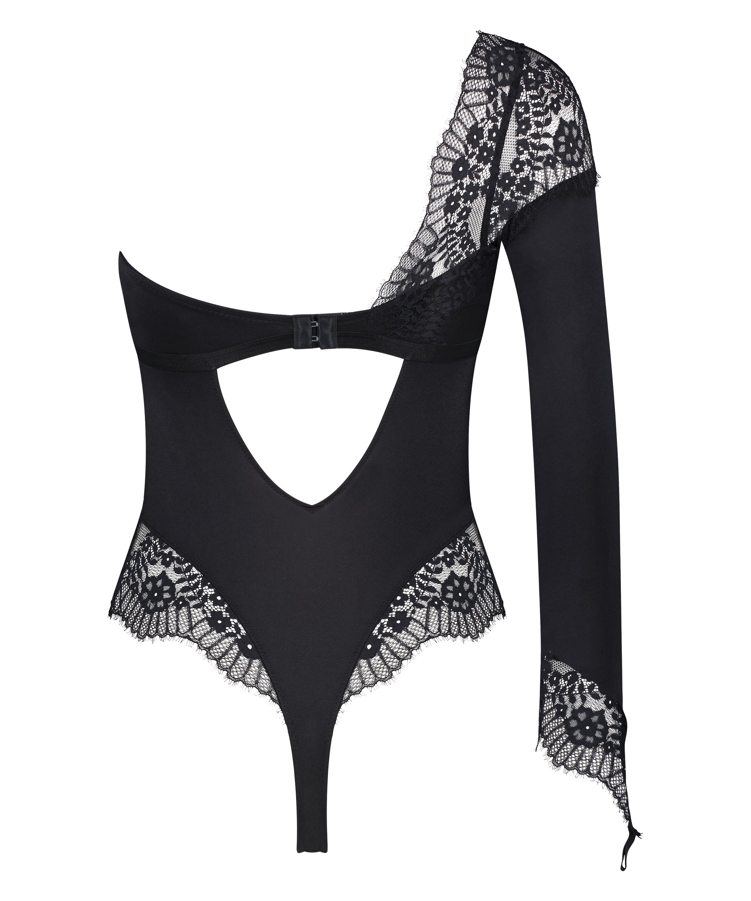 Ce body présente un design unique à une épaule avec des détails en dentelle délicate pour un look audacieux mais élégant. La combinaison de tissus opaques et transparents ajoute du contraste et de l’allure, tandis que la dentelle s’étend à la manche et à la ligne de hanche pour une finition raffinée. Son encolure asymétrique et sa coupe ajustée créent une silhouette moderne et flatteuse. Conçu pour allier style et confort, cette pièce est parfaite pour affirmer votre style.
