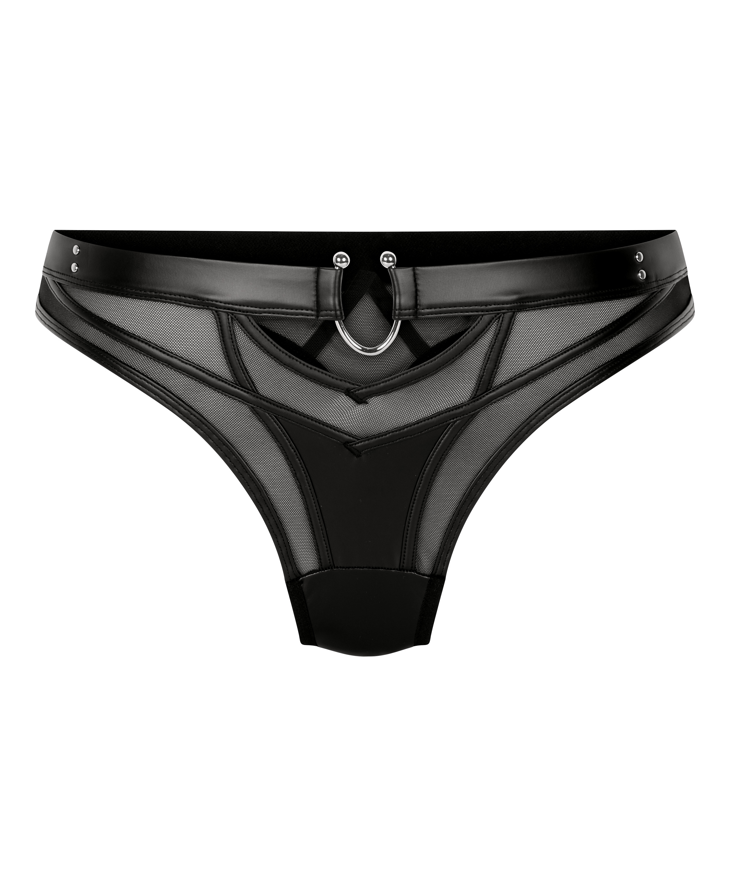 Faites monter la température avec notre string - mélange audacieux de texture, de transparence et d'attitude. Cette pièce remarquable est composée de similicuir et de panneaux en maille pour un contraste à la fois audacieux et raffiné. Les clous argentés ajoutent une touche de glamour et confèrent à ce string un côté rebelle, parfait pour un style affirmé. Associez-lui le soutien-gorge assorti pour un look complet.